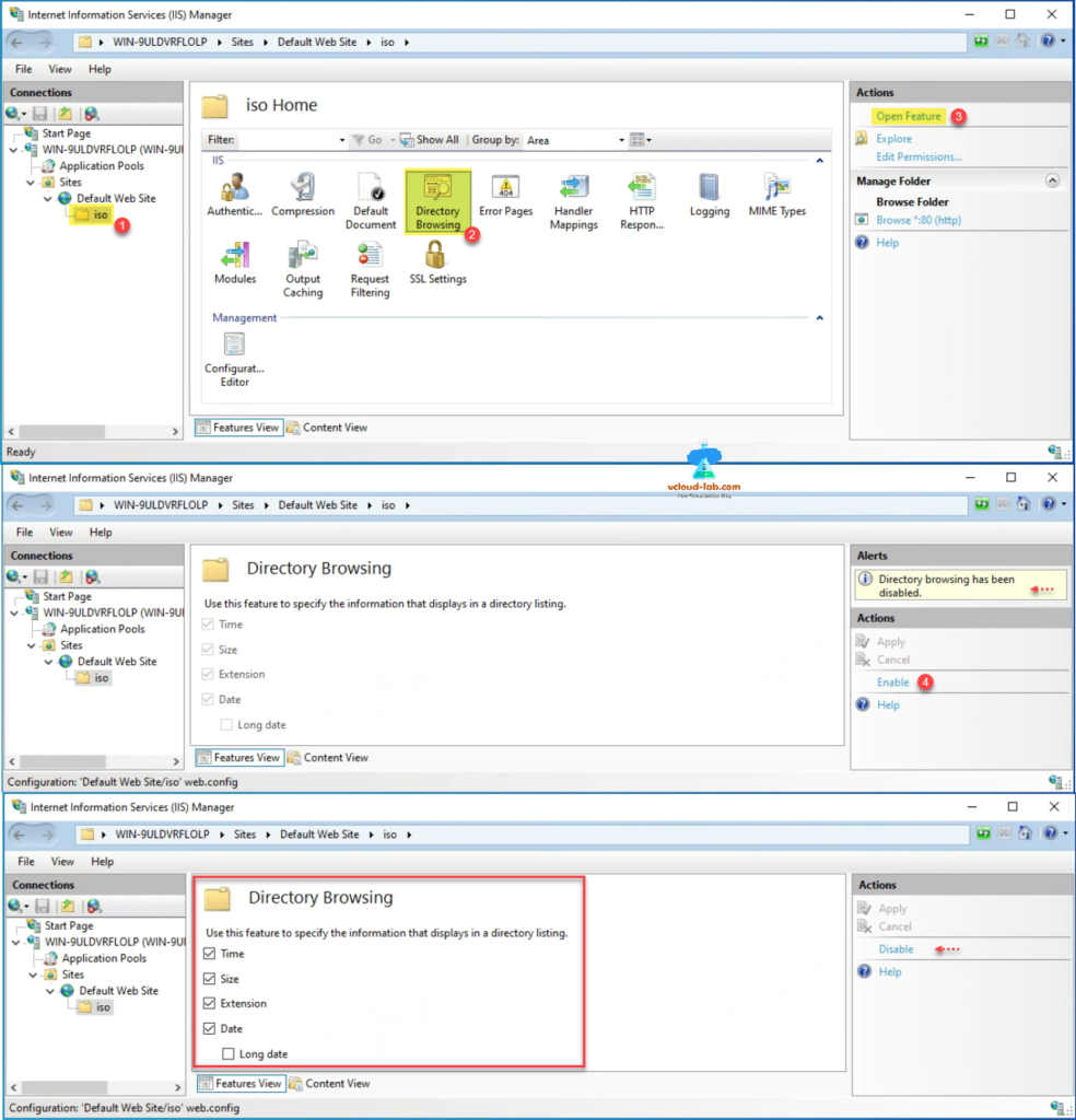 For this in IIS manager expand Server > Sites > Your Website > iso directory in left pane. From middle pane choose Directory Browsing and in the Right side Actions pane click Open Feature. At the moment you can see Directory browsing has been disabled by default. Click Enable. As you can see Directory browsing/listing is enabled.