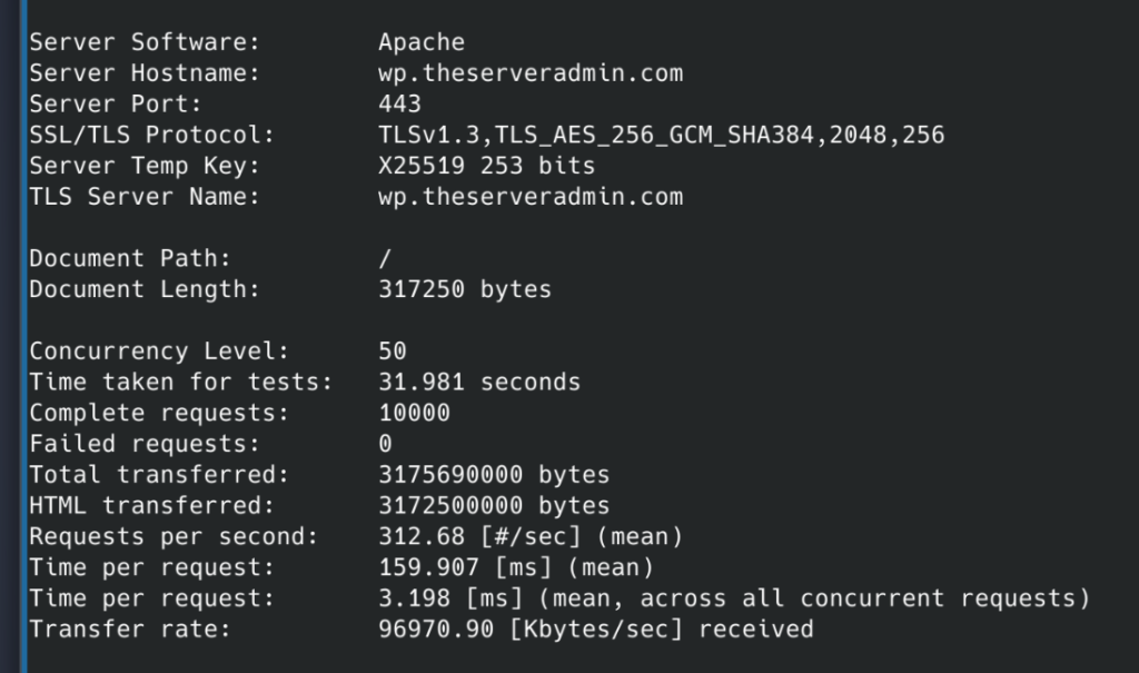 312 requests per second at 50 concurrent connections. Let us do some math.